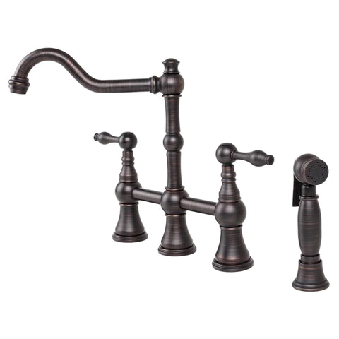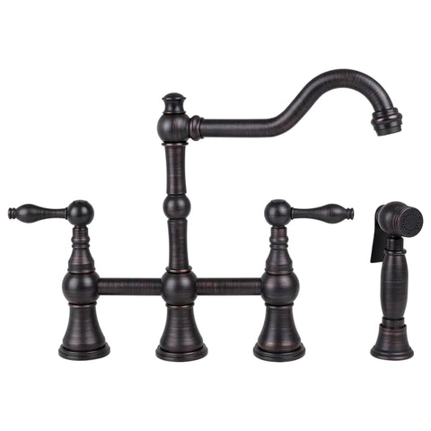 Fontaine by Italia is proud to present its Brienza by Italia traditional 4-hole kitchen bridge faucet in Oil Rubbed Bronze. Straight lines are paired with gentle curves and ribbing details to create a look that is sure to draw praise from onlookers. Smooth handle operation, ceramic disc valves, and a sturdy feel go hand in hand with its beautiful design and antique copper finish. A separate all metal pull-out side sprayer is included. This is one solid, heavy faucet made from only the finest materials and it is sure to last you a long time.