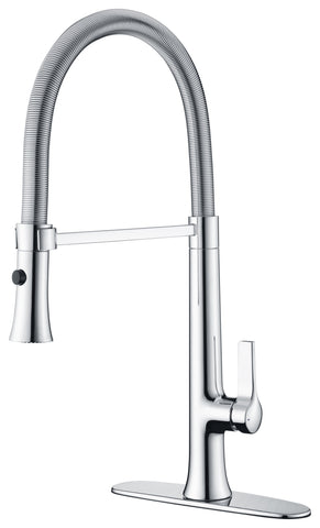 Complete your kitchen transformation with this Fontaine by Italia Varenne modern European residential thin coil spring kitchen faucet available in chrome and brushed nickel. This faucet features a 2-function spray head and a coil spring neck for ease of use when cleaning large cookware. Installs in a single-hole mount applications or a 3-hole 8 inch spread mount when using the included deck plate. The faucet uses the spring as its pull-down method rather than a hose with a weight making the faucet's return to its holder perfect each time. By not using a weight under the counter, we eliminate snagging. This high-end faucet is easy to install and use and you are sure to love it.
